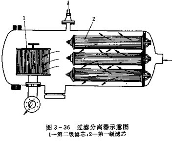 ②過濾分離器,為了獲得高潔凈度燃油,在管路中需加裝高性能的過濾分離器,將油中的水分,膠質和雜質分離出來,圖3-36為兩級過濾分離器。第一級濾芯2為聚結濾芯,由經過特殊處理的濾紙或玻璃纖維,合成材料,毛氈、棉織品等制成。油流經濾芯時,首先濾出的固體物質,再將膠質分離,同時將分離出的小水粒聚集成大水滴,落入由外殼形成的集水器中,第二級濾芯1為分離器濾芯,表面涂有聚四氟乙烯的表面滑下,滴入集水池中,達到徹底分離水的作用。